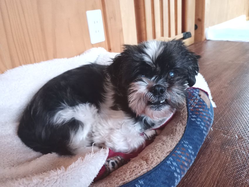 2023年8月、札幌市動物管理センターより引き取った推定15歳のシーズーまるちゃん。真夏に公園に捨てられていました。皮膚や目の状態が悪く治療が必要でした。イボがあり腫瘍の疑いがありましたがやはり悪性だったようで3か月後に虹の橋を渡りました。短い間だったけど家に来てくれてありがとう